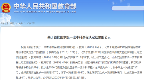 10月30日,根据《关于首批国家级一流本科课程认定结果的公示》,公司由方正军副教授作为负责人的《无机化学》课程被认定为线下一流课程,成为3560门首批国家级一流本科课程之一。