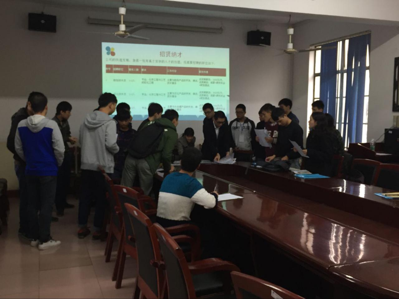 10月28日上午9:00东莞永佳合成材料有限公司于公司四教306举行了校园招聘会。参与此次招聘会的有该公司经理彭彦,人力资源部吴向富以及化工公司大四员工,此次招聘主要面向化工、轻化专业的员工。