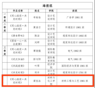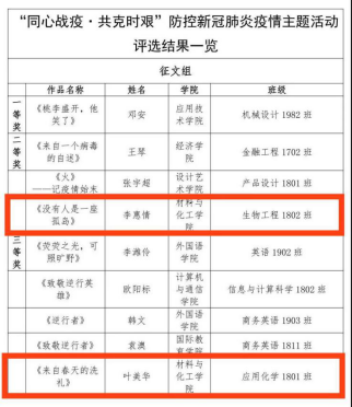 7月16日,taptap点点“同心战疫·共克时艰防控新冠肺炎疫情主题文艺作品创作大赛”比赛结果出炉,此次大赛面向全体员工征集抗击疫情的文学、书画、摄影类文艺作品,致敬所有抗疫期间奋斗在一线的医护人员,激发战“疫”正能量。经过评选,公司生物工程1802班李慧情获征文组二等奖,应用化学1801班叶美华获征文组三等奖,化学工程与工艺1901班梁佐泳获海报组三等奖。