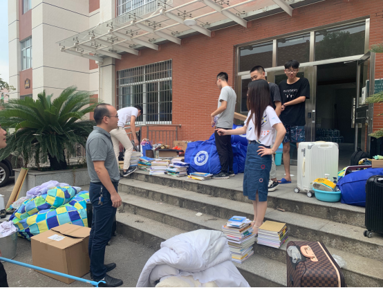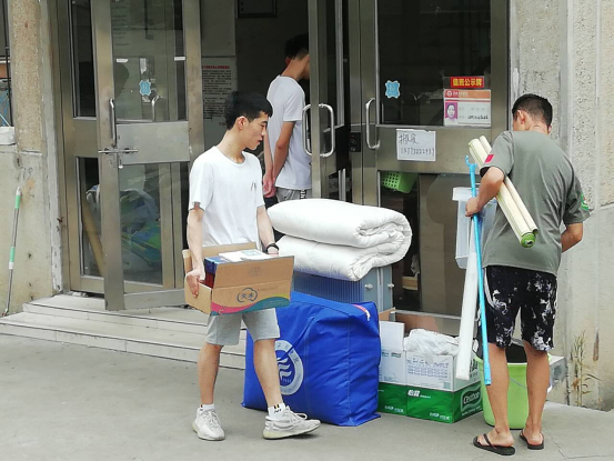 早上8:30搬迁工作准时开始,同学们有条不紊的将自己前一天晚上打包好的行李搬至楼下。夏日炎炎,头顶的太阳没有一丝松懈的想法,虽然同学们早已热的汗流浃背,但是依旧没有停下手中的工作。现场有许多已经搬完自己行李的同学没有选择休息,而是选择帮助其他没有搬完行李的同学。