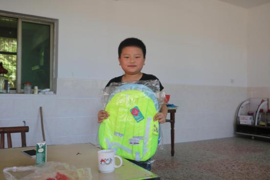 (小朋友拿着新书包开心的笑了)