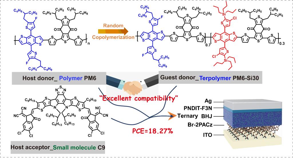 该工作通过将氯和烷基甲硅烷基取代的苯并二噻吩(BDT)单元插入到聚合物PM6中,构建了三元共聚物PM6-Si30,该三元共聚物表现出深的最高占据分子轨道,与PM6和BTP-eC9均有良好的混溶性,使其能够用作OSC的PM6:PM6-Si30:BTP-eC9本体异质结的第三组分。所得电池的最大光电转换效率 (PCE)为18.27%,达到国际先进水平。PM6:PM6-Si30:BTP-eC9电池的性能增强归因于改进的电荷传输、有利的分子排列、减少的能量损失和抑制双分子重组。这项工作证明了无规三元共聚物作为OSC中第三组分的潜力,并突出了构建具有改进光伏性能的三元系统的新策略。