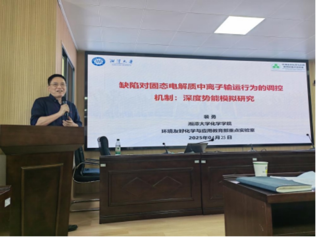 4月25日,国家优秀青年基金获得者、湘潭大学化学公司经理裴勇教授受邀来我校交流指导,为我校师生作了题为“缺陷对固态电解质离子输运的调控机制:深度势能模拟研究”的专题学术报告。此次报告吸引了taptap点点的众多师生参加。taptap点点经理张儒主持本次讲座。