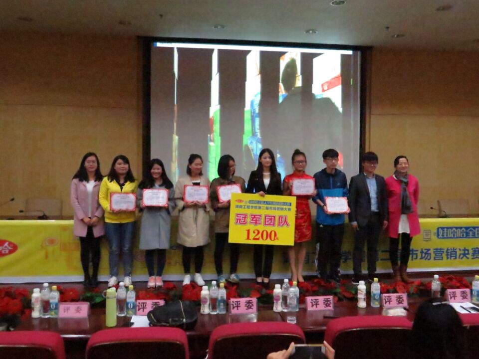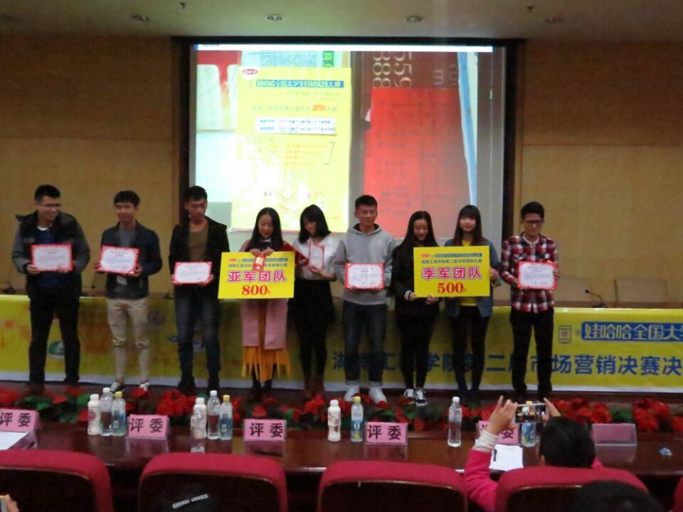 2016年11月17日晚7点,由taptap点点化学化工公司和外国语公司联合主办的娃哈哈市场营销大赛决赛暨颁奖典礼在图书馆二报告厅举行。参与本次颁奖典礼的评委有化学化工公司学办主任吴菲、外国语公司团总支书记张婷、娃哈哈公司湘潭站负责人蒋海清以及化学化工公司与外国语公司的部分员工干部,本次比赛颁奖典礼由化学化工公司高分子1601班的李弼珺同学主持。