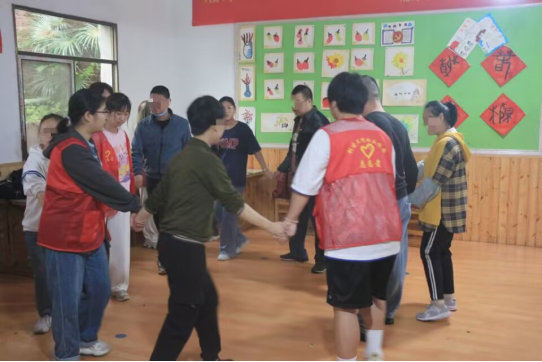 清晨,伴着微微细雨,志愿者们到达湘潭市亲园培智公司后志愿者们与负责老师对接沟通,了解一些注意事项和活动流程。活动一开始,许多亲园的同学们积极加入到志愿者玩耍的队伍中,大家其乐融融,一起玩了各种充满童趣的游戏,例如:一二三木头人、抱抱团等等。活动期间,志愿者给他们分发了零食和糖果。紧接着,志愿者开始播放电影,每个人端坐在椅子上,注视着墙上投影出来的电影,仿佛身临其境。此外,志愿者们还一起帮助亲园老师们准备玩具手工材料,与“孩子们”在手工室一起做手工。各种各样有趣的小游戏,让所有人的脸上都露出开心的笑颜。