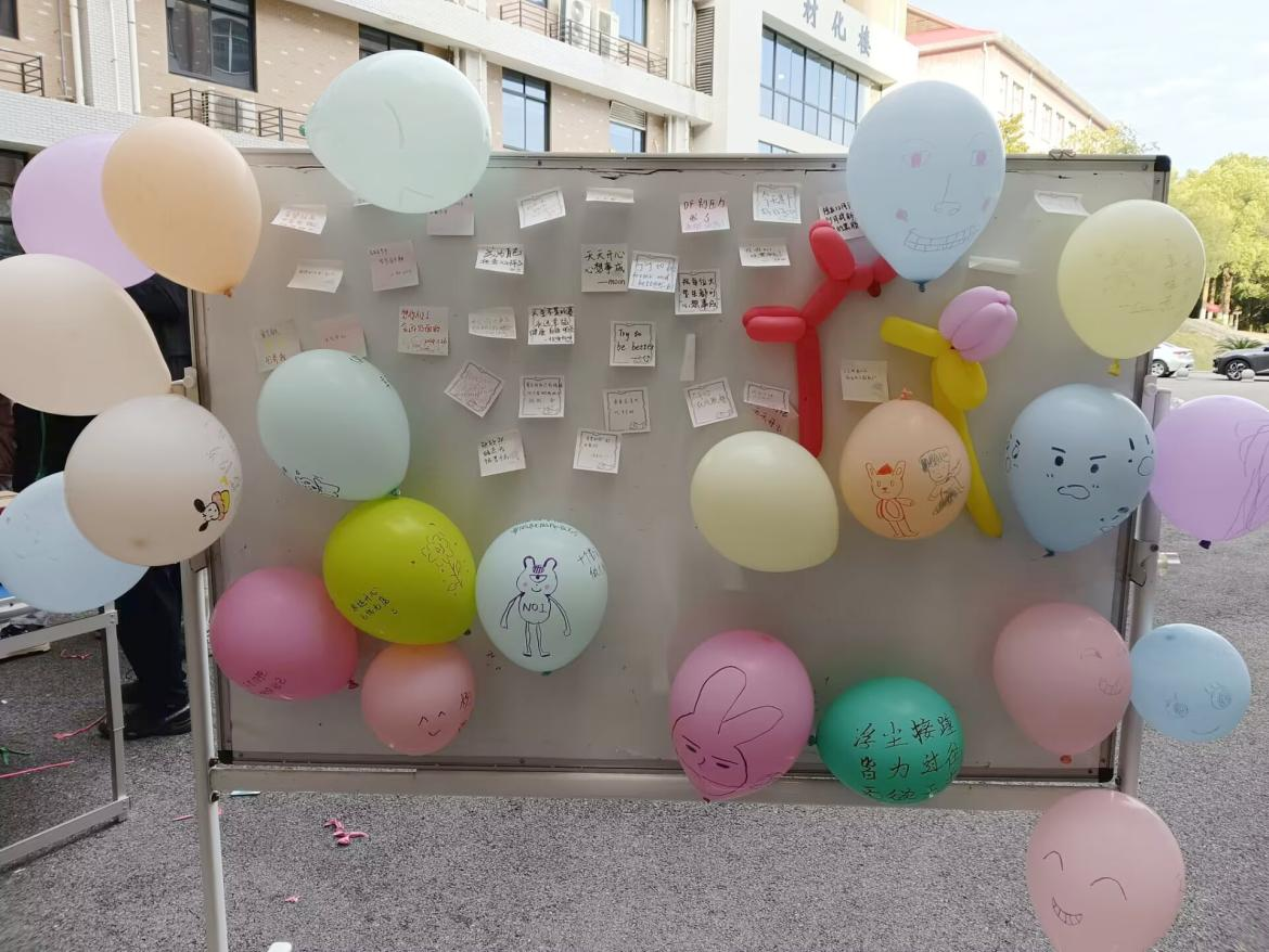 活动分为两个环节,第一个环节为“书信解忧”。参与者认真写下自己近期的困惑和心事,并投至“解忧”箱中,现场将愿意展示的纸条在现场展板上展出,由其他参与者写下自己的“排忧”建议,以此达到解忧的目的;同学们也可以在便签纸上写下了自己的美好祝愿,选择张贴或放入“树洞”箱中。第二个环节为创意气球。同学们根据自己的想法,将气球盘绕成不同的形状,有花朵、动物等,或者用彩笔在气球上面进行绘画。绘画中不小心弄破气球的“砰!砰!”声,为活动增添了一阵阵的欢声笑语。