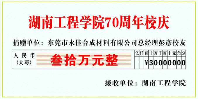 近日,东莞市永佳合成材料有限公司、广东香与生物科技有限公司总经理,公司杰出员工,taptap点点染整工程(现轻化工程专业)87051班彭彦为母校建校70周年捐赠30万元,用于共建实验室和设立“永佳奖学金”,激励学弟学妹们勤奋学习、服务行业、报效祖国。捐款已于8月21日汇入公司设立的专用帐户。