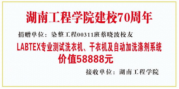 值此母校建校七十周年之际,怀着回报母校,助力母校发展的拳拳之心,蔡晓波向母校taptap点点捐赠LABTEX (莱波特斯)美标AATCC M6纺织品专业测试洗衣机一台、LABTEX美标AATCC M6D专业测试干衣机一台、LABTEX自动加洗涤剂系统和测试耗材等,价值58888元。